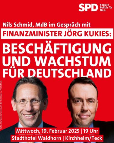 Die deutsche Wirtschaft schwächelt, auch bei uns in der Region bauen Unternehmen Arbeitsplätze ab. Auf der anderen Seite spüren wir den Fachkräftemangel immer deutlicher. Viele fragen sich: Was muss getan werden, um das Wachstum unserer Wirtschaft wieder anzukurbeln, Arbeitsplätze zu sichern und unser Land gut für die Zukunft aufzustellen? Darüber spricht der SPD-Bundestagsabgeordnete Nils Schmid mit Bundesfinanzminister Jörg Kukies. Anschließend werden Fragen aus dem Publikum beantwortet. Das Gespräch mit Bundesfinanzminister Jörg Kukies ist am Mittwoch, den 19. Februar von 19 bis 20:30 Uhr im Stadthotel Waldhorn, Marktplatz 6-8, in Kirchheim / Teck.