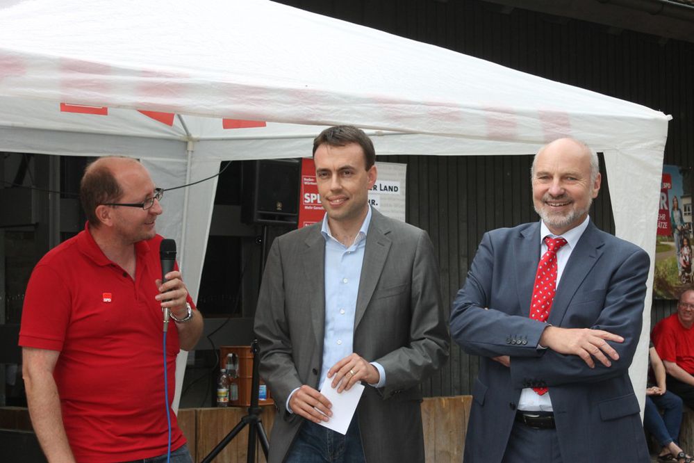Finanz- und Wirtschaftsminister Dr. Nils Schmid (Bildmitte) streifte nach der Begrüßung durch SPD OV-Vorsitzenden Jörg Pauly (links im Bild) als Gastredner mehrere Politikfelder. Die SPD stehe im Bund wie im Land für eine solide Finanzpolitik. Im Gegensatz zur schwarz-gelben Bundesregierung, die in der vergangenen Legislaturperiode 100 Milliarden Euro neue Schulden gemacht habe. Dass die CDU nun im Wahlkampf Steuersenkungen propagiere, gleichzeitig aber auch mehr Geld für Bildung oder für die Mütterrenten ausgeben und zudem noch Schulden abbauen wolle, sei „eine Milchmädchenrechnung, die nicht aufgeht“. Das Land Baden-Württemberg würden die Steuerpläne der CDU unterm Strich eine Milliarde Euro kosten, so Dr. Schmid.