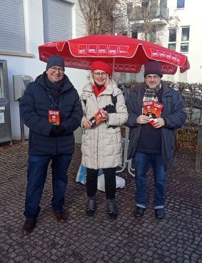 Es erwarten Sie aktuelle Artikel von eigenen Veranstaltungen oder mit Themen aus unserer Stadt. Unsere Parteistände und sonstige Termine zur Landtagswahl am 8. März finden Sie in der Rubrik "Termine" angekündigt. Auf dem Foto sehen Sie unsere Vorstandsmitglieder Jörg Pauly, Regina Gabriel und Hans-Ulrich Kramer (v.l.) am Parteistand in Leinfelden am 31. Januar. Sie haben dort über die Wahl und unseren SPD-Kandidaten Tim Reeth informiert. Tim Reeth war am Samstag, 24. Januar, persönlich an unserem Stand in Echterdingen (s. Startseite weiter unten). Seine Homepage: Home - Tim Reeth