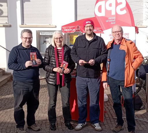 Auf dem Foto sehen Sie unsere Vorstände Hans-Ulrich Kramer, Regina Gabriel, Parteimitglied Rolf Hirschbühl und unseren Vorstand Jens Rudat auf dem Markt Leinfelden (v.l.).